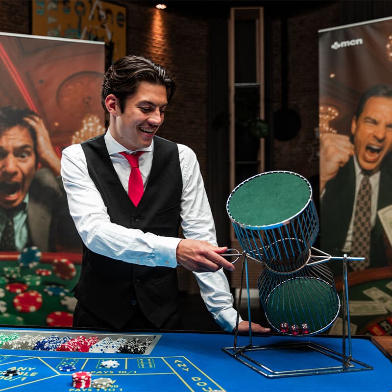 Met Chuck-a-Luck huren haal je een uniek casinospel naar jouw event dat draait om spanning, geluk en dobbelstenen. In dit spel rollen drie dobbelstenen in een speciale kooi. Gasten zetten hun fiches in op een getal, combinatie of uitkomst waarvan ze denken dat de dobbelstenen zullen vallen. De spanning stijgt wanneer de kooi wordt gedraaid en de dobbelstenen tot stilstand komen. Chuck-a-Luck is eenvoudig te leren en daardoor perfect voor ieder type evenement: van bedrijfsfeest en personeelsuitje tot bruiloft of gala. Onze professionele croupier legt de regels rustig uit en zorgt dat iedereen meteen kan meedoen. Combineer Chuck-a-Luck met klassiekers als roulette, blackjack of poker en maak jouw casino avond op locatie compleet.