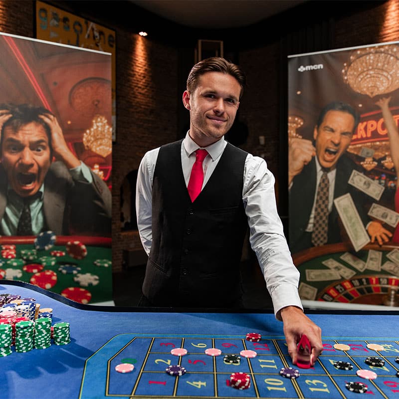Nee. Bij ons draait alles om plezier: er wordt nooit met echt geld gespeeld. Gasten krijgen fiches en speeldollars en ervaren zo de spanning van het spel, zonder risico’s. Want eerlijk is eerlijk: geld verliezen op een feestavond is nooit leuk.